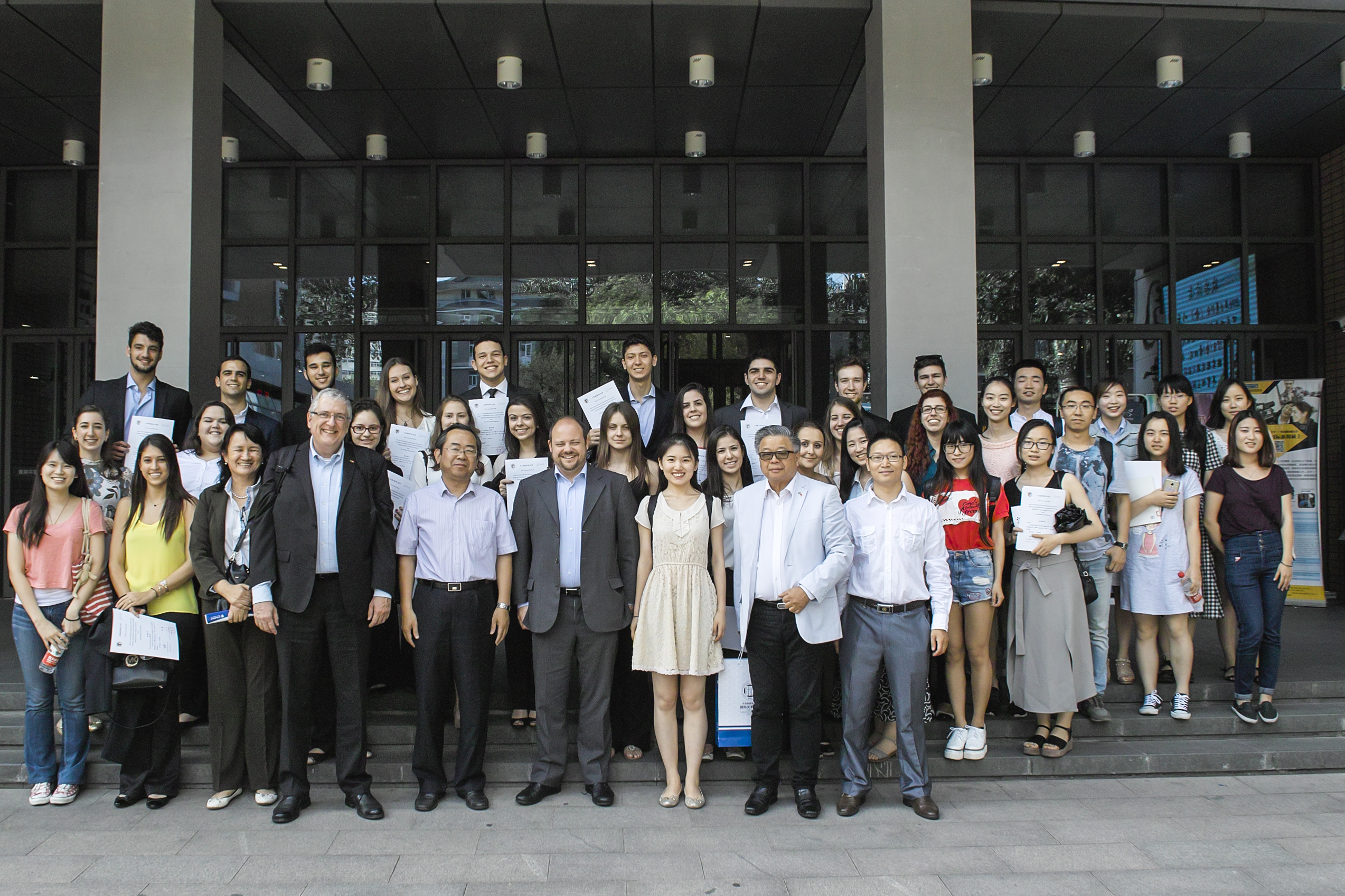 在交流项目的尾声,坎皮纳斯公司员工与北外员工交换了联系方式,全体参与此次项目的师生在北外图书馆前进行合影留恋,双方也共同交换了礼物。最后国关院的员工热情地带领新朋友们参观校园。