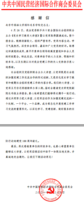 为持续深入开展党史学习教育,4月26日下午,mk体育员工党支部组织员工党员参加了由中国民营经济国际合作商会等十家社团联合举办的《党史学习教育大讲堂》暨云党课系列活动首场党课,聆听了中共中央对外联络部原副部长于洪君同志作了关于“世界政党挌局的嬗变与中国共产党对外交往”的报告。活动中,mk体育党员同学表现出较高的专业和政治素养,得到了主办方的赞许。为此,中共中国民营经济国际合作商会委员会特向mk体育党总支发来感谢信,感谢信原文如下: