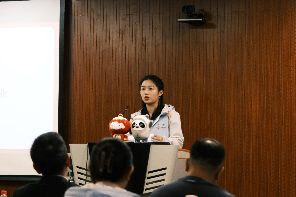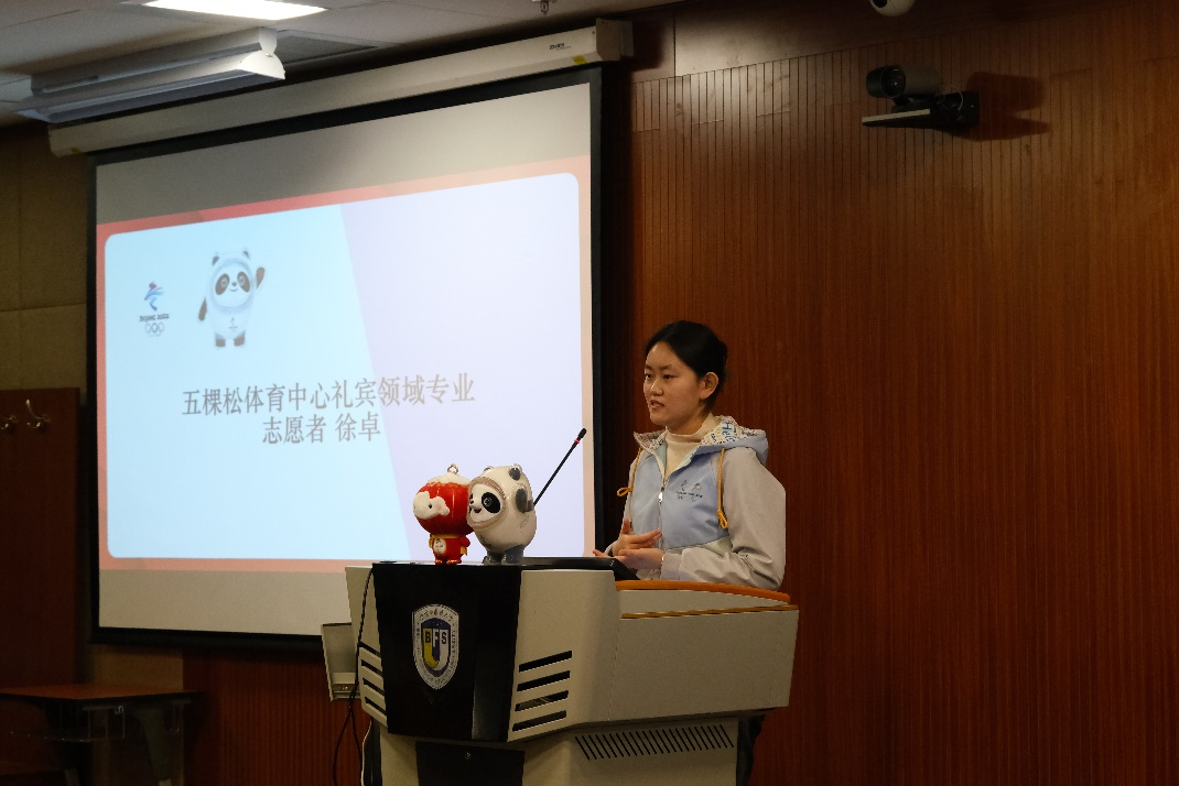 国家速滑馆体育展示领域专业志愿者何婧旸同学分享了自己担任推免保辅导员期间的员工工作经验,以及建国七十周年阅兵典礼上参与 “圆梦奥运”群众方阵的经历。她鼓励志愿者们通过冬奥志愿,传播北外声音、中国声音,表达了对于志愿者们的美好祝愿。