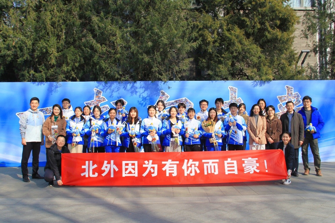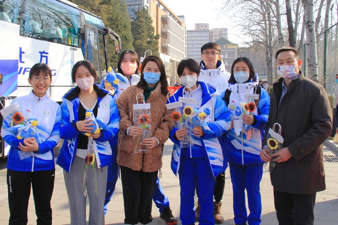 38日下午,公司首批首钢滑雪大跳台冬奥师生志愿者圆满完成北京2022年冬奥会志愿服务任务,从隔离地点平安返校。公司党总支书记张效民老师、辅导员钱梦婷老师、辅导员张翊老师及同学们早早等候在东校区文化广场,热烈欢迎志愿者们凯旋。