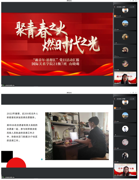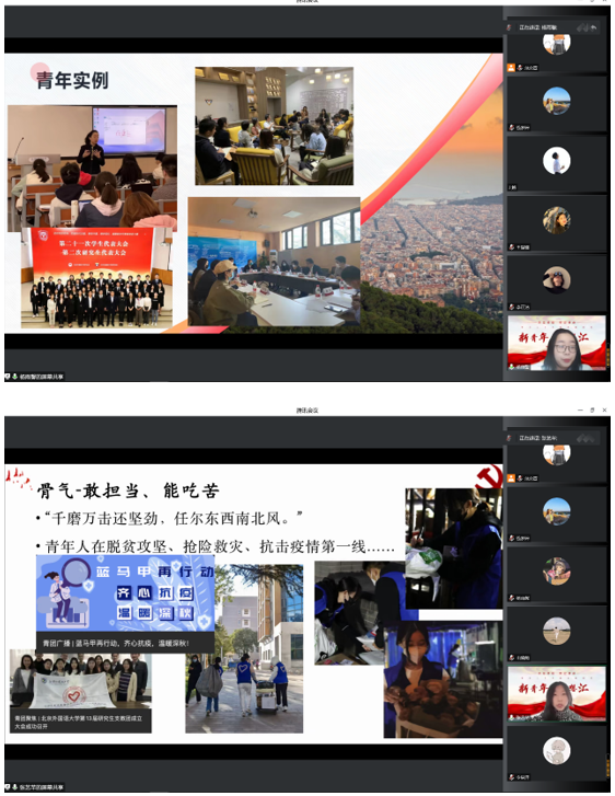 会议开始,mk体育本科生党支部书记钱梦婷老师从总书记对青年的工作的论述引入,讲解阐述青年与时代的关系、青年工作的地位、青年思想引领的主要任务和内容、青年工作的方法论等内容,回顾总书记对广大青年的殷切期盼和谆谆教诲。在抗击疫情、乡村振兴、志愿服务等国家大事中,钱老师对北外国关学子积极踊跃的参与给予高度的认可。