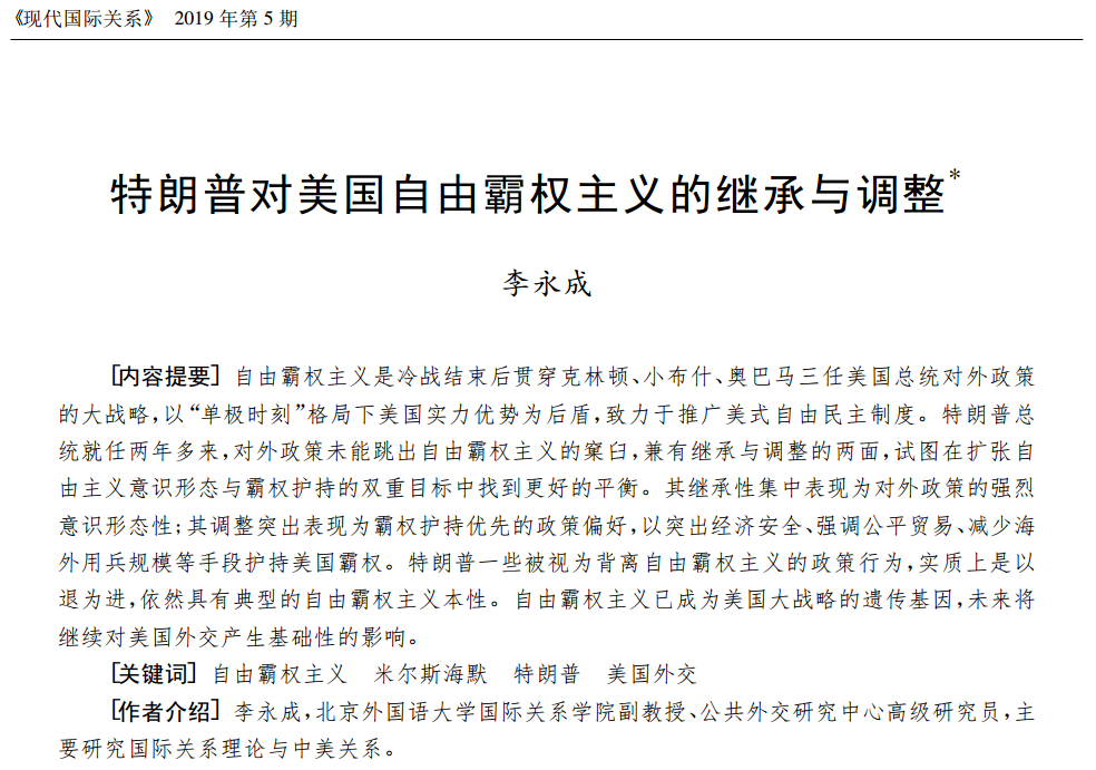 mk体育李永成副教授在CSSCI期刊《现代国际关系》2019年第5期发表论文《特朗普对美国自由霸权主义的继承与调整》,论文摘要和原文链接如下: