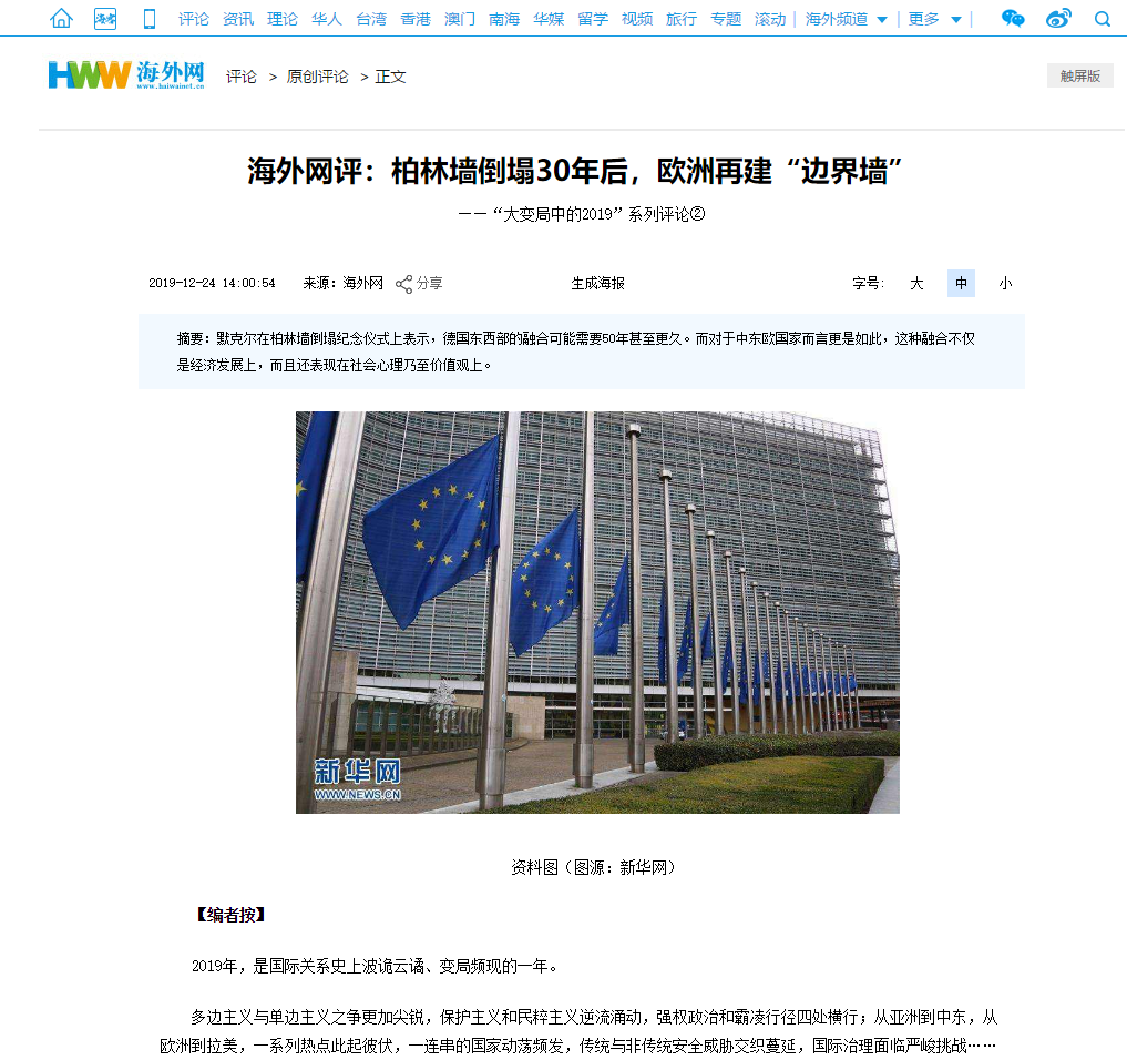 mk体育王明进副经理作为海外网特约评论员发表文章,题目是《柏林墙倒塌30年后,欧洲再建“边界墙”》。该文是海外网推出的年终系列国际评论,“回望‘大变局中的2019’”的第2篇。海外网致力于打造中国在海内外具有重要影响力的新媒体国际传播平台,第一时间向读者提供中国热点、国际时政,特别是涉华国际新闻事件的权威解读。以下是文章题头截图、摘要和文章原文地址。