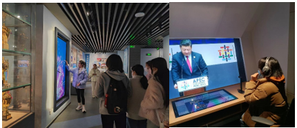 第四部分“盛于伟大复兴的新时代”则记录了公司从2012年步入新时代以来的发展成就。同学们纷纷主动体验校史馆设置的“员工查询系统”“同传体验室”。在志愿者同学指导下,同学们还体会了“语种树”中不同语种原声的“你好”并加以录音模仿。