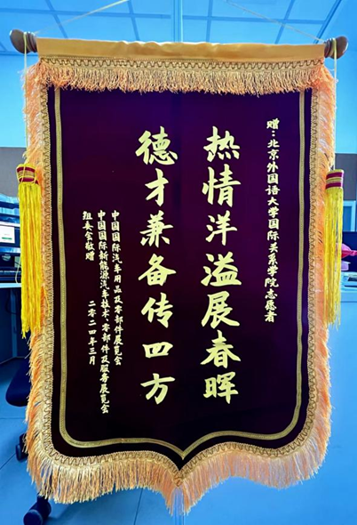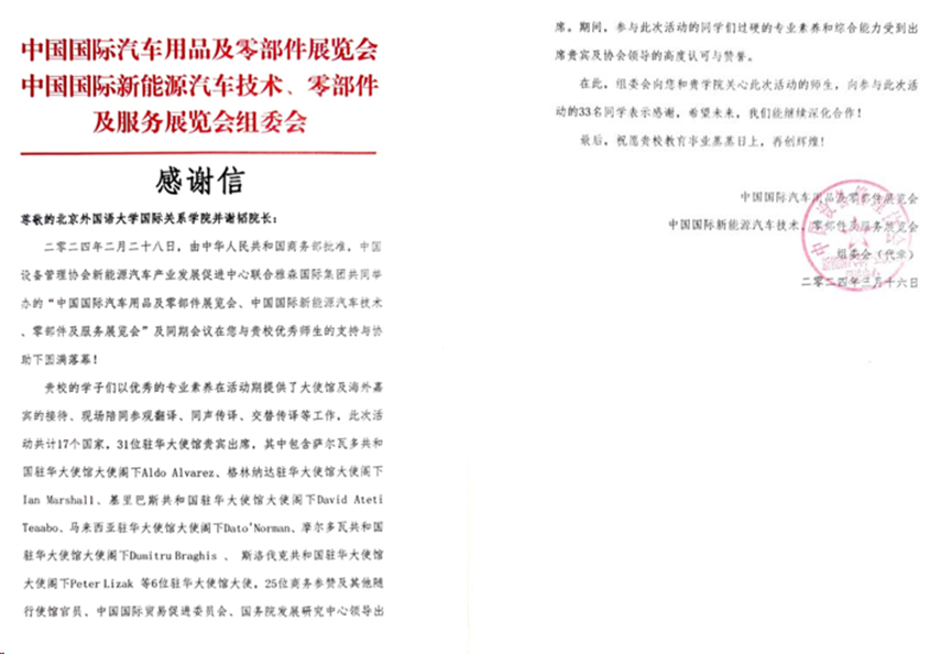 第34届中国国际汽车服务用品及设备展览会暨第2届中国国际新能源汽车供应链大会于2024年2月28日至3月2日在北京中国国际展览中心举办,北外mk体育共派出33名志愿者参与外宾接待服务。此次会展活动共有17个国家参与,31位驻华大使馆贵宾出席,其中包括6位驻华大使馆大使与25位商务参赞,以及其他随行使馆官员、中国国际贸易促进委员会、国务院发展研究中心领导。期间,参与此次活动的同学们凭借过硬的专业素养和综合能力,赢得了出席贵宾及协会领导的高度认可与赞誉。