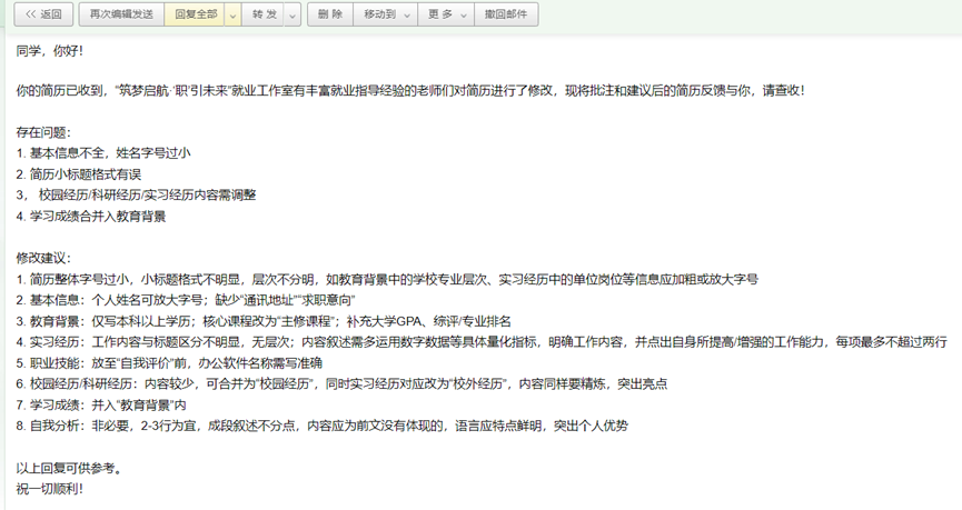 为了能够为同学们提供专业且具有针对性的求职指导与帮助,工作室进行了精心的组织与筹备,mk体育组织员钱梦婷老师、法公司辅导员刘时剑老师,阿拉伯公司辅导员杨一凡老师,mk体育辅导员褚静璇老师对同学们的简历进行了内容调整、格式优化、亮点提炼等具体的修改建议,最终由工作室员工团队以邮件形式给予同学们“一对一”的反馈。