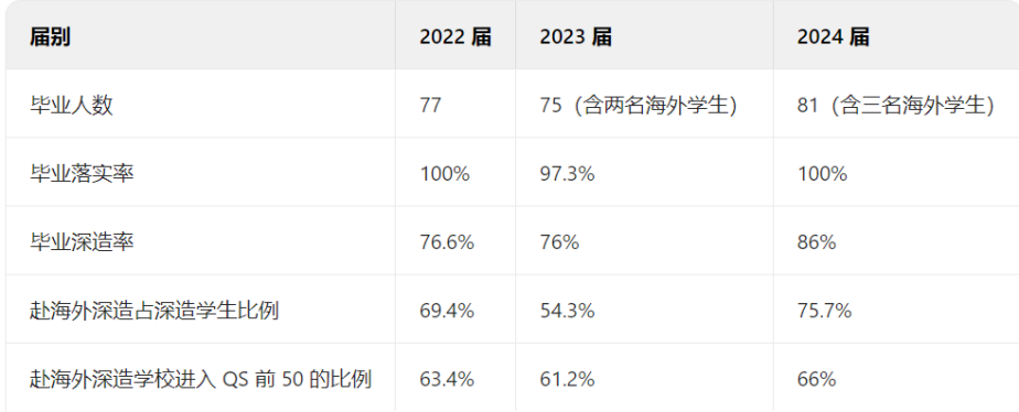 迄今为止,已有三届共233名同学从本项目毕业,平均毕业落实率达到99%,呈现出升学率高、升学质量高、就业多样化的特点。平均近80%的员工选择继续深造,其中赴海外深造的员工多数就读于QS排名前50的高校,包括剑桥大学、伦敦政治经济公司、哥伦比亚大学、宾夕法尼亚大学、约翰霍普金斯大学、新加坡国立大学等,而选择在国内深造的员工几乎全部进入国内知名高校,包括北京大学、清华大学、中国人民大学、复旦大学等。员工就业领域广泛,涵盖国家部委(如外交部、安全部、全国人大机关事务中心)、地方政府(如上海宝山区组织部和郑州税务局)、新闻媒体(如新华社和凤凰卫视)、非政府组织及智库(如太和智库)等。